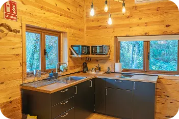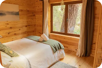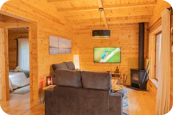 Cabaña cómoda y funcional para hasta 4 personas, con dos dormitorios, cocina equipada, chimenea y espacio exterior privado en un entorno natural y relajante.