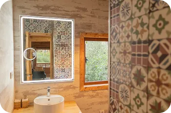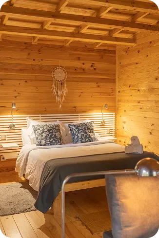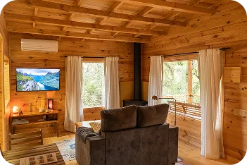 Romántica cabaña tipo suite, ideal para parejas, con cocina equipada, chimenea y porche privado, rodeada de bosque y pensada para una escapada tranquila en plena naturaleza.